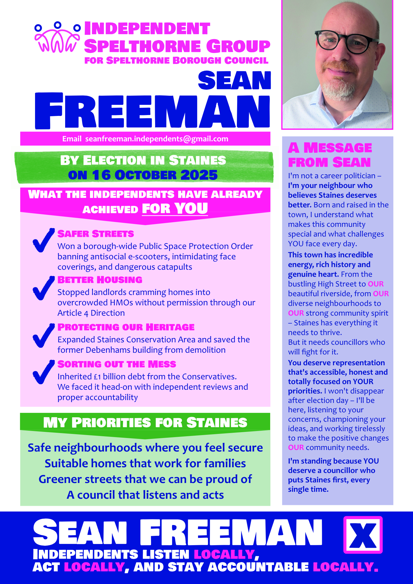 Meet Sean Freeman: Independent Spelthorne Group Candidate for Staines By-Election October 16th 2025 #StainesMatters #LocalVoice