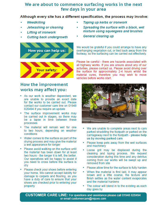 Although every site has a different specification, the process may involve: • Weedkilling• Jetwashing or cleaning• Lifting of ironwork• Cutting back undergrowth• Taping up kerbs or ironwork• Spreading the surface with a black, wet mixture using squeegees and brushes• General clearing up